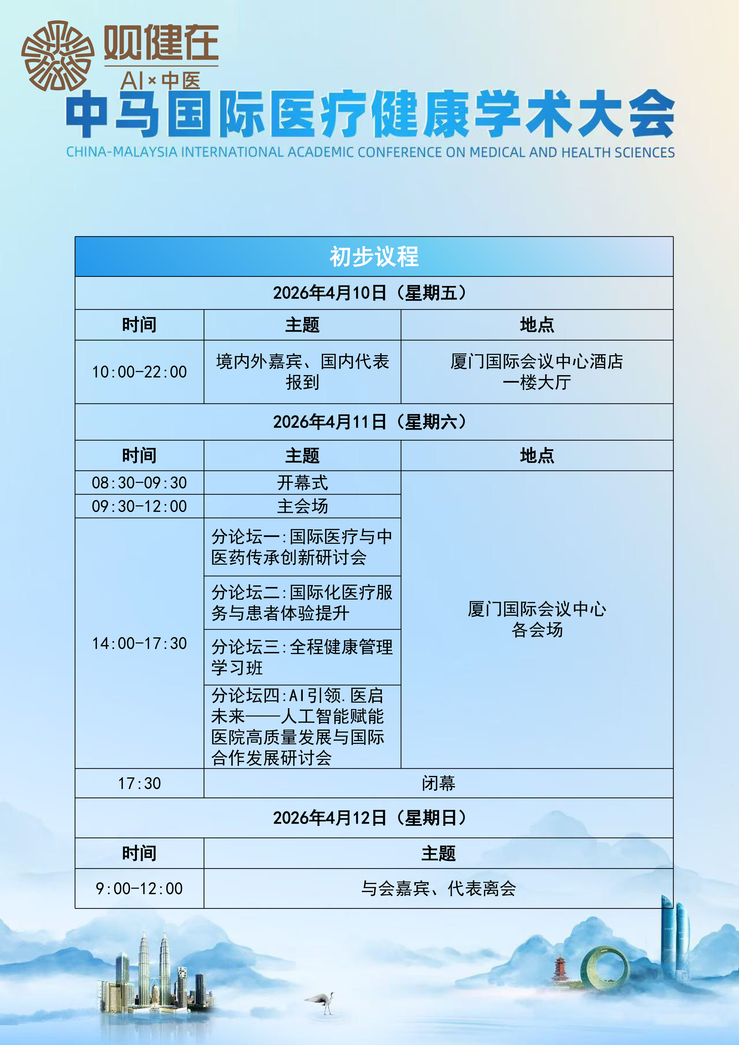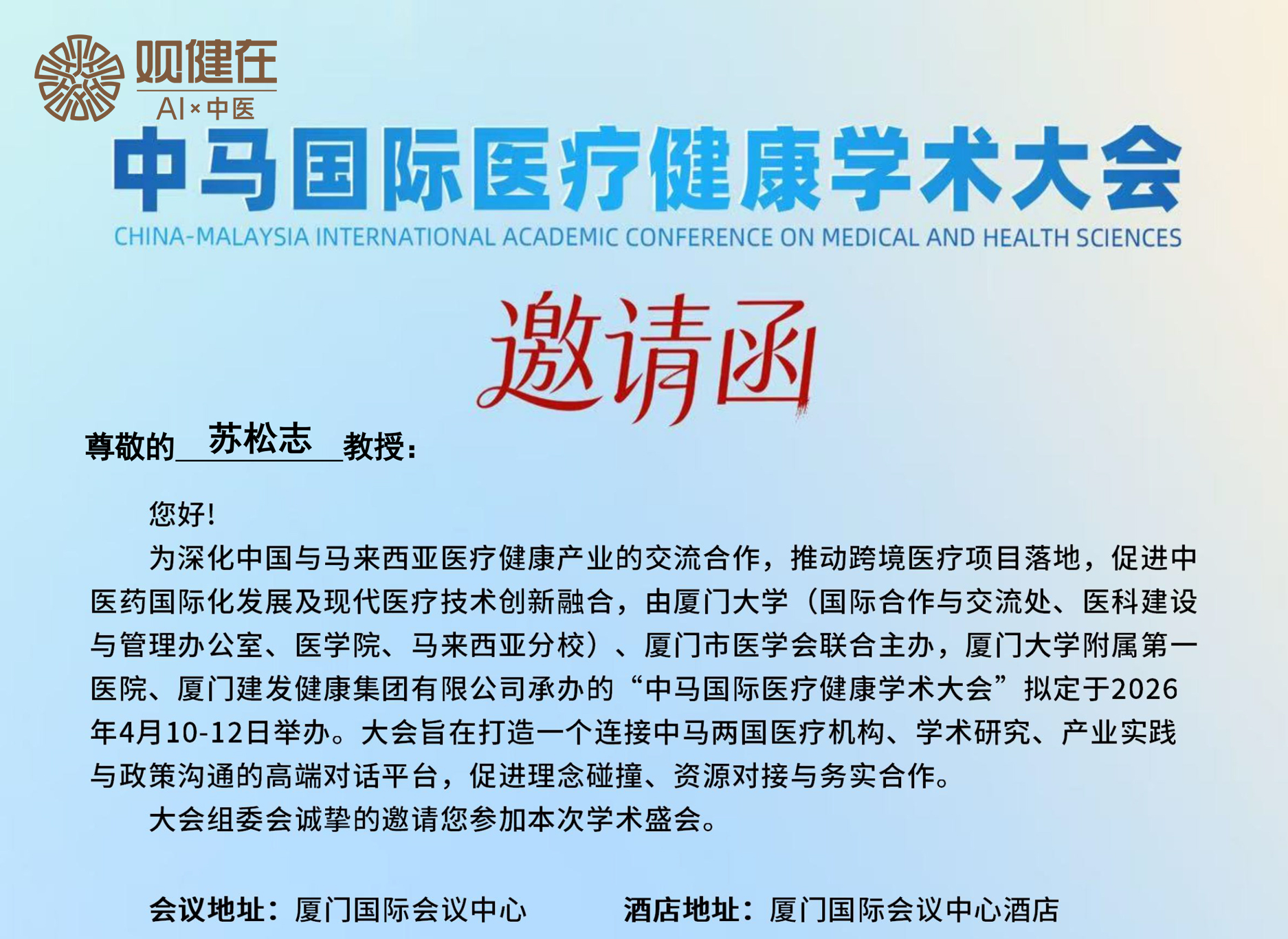 近日,观健在(厦门)智能科技有限公司创始人苏松志博士正式收到中马国际医疗健康学术大会组委会邀请,将出席于2026年4月10日至12日在厦门国际会议中心举办的“中马国际医疗健康学术大会”,并在分论坛“AI引领·医启未来——人工智能赋能医院高质量发展与国际合作发展研讨会”上发表主题演讲。