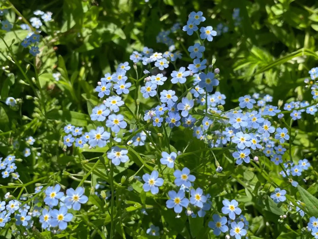 附注:本植物的花朵小巧秀丽,色泽纷繁;蓝色花朵中央镶嵌着一圈黄色花蕊,色彩和谐醒目;尤其卷伞花序随着花朵的开放而逐渐伸展,半含半露,煞是惹人喜爱,令人难以忘怀。青年男女互赠此花,以表达“永不变心、不会忘记”的深情厚意,故名“勿忘我花”。
