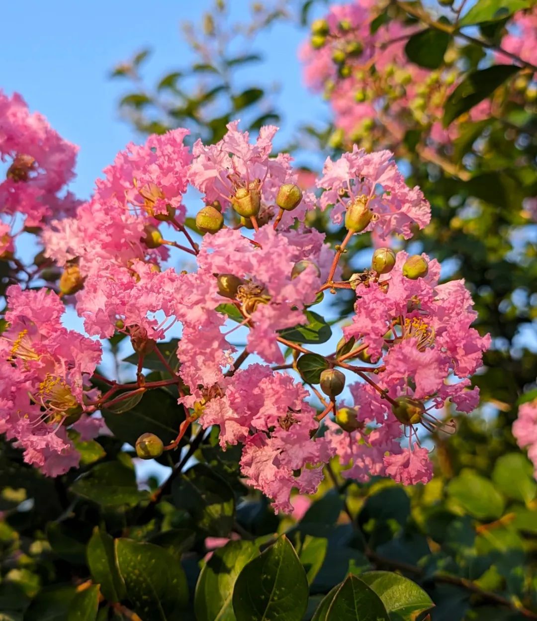 附注:紫薇树干古朴光洁,树身如有微小触动,枝梢就颤动不已,故又被称为“怕痒树”、“痒痒树”。